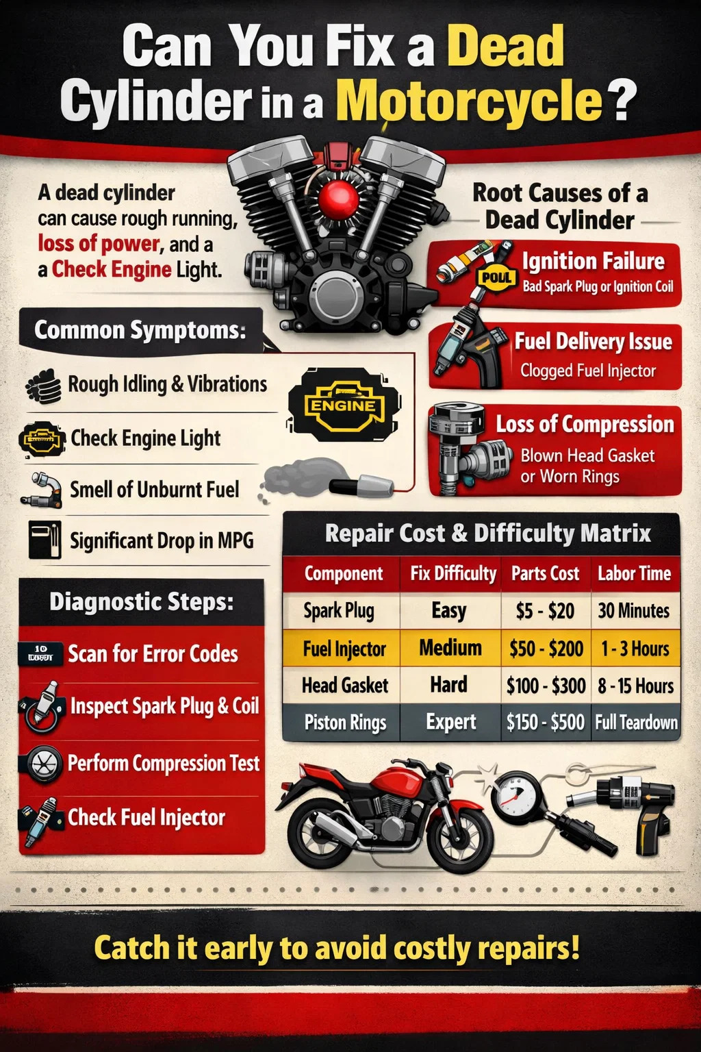 إصلاح الاسطوانة الميتة هو مسألة عملية. إذا اكتشفت ذلك مبكرًا، فإنك تمنع الوقود غير المحترق من غسل الزيت عن جدران الأسطوانة أو انسداد المحول الحفاز باهظ الثمن، مما قد يؤدي إلى وإصلاحات أكثر تكلفة على الطريق.