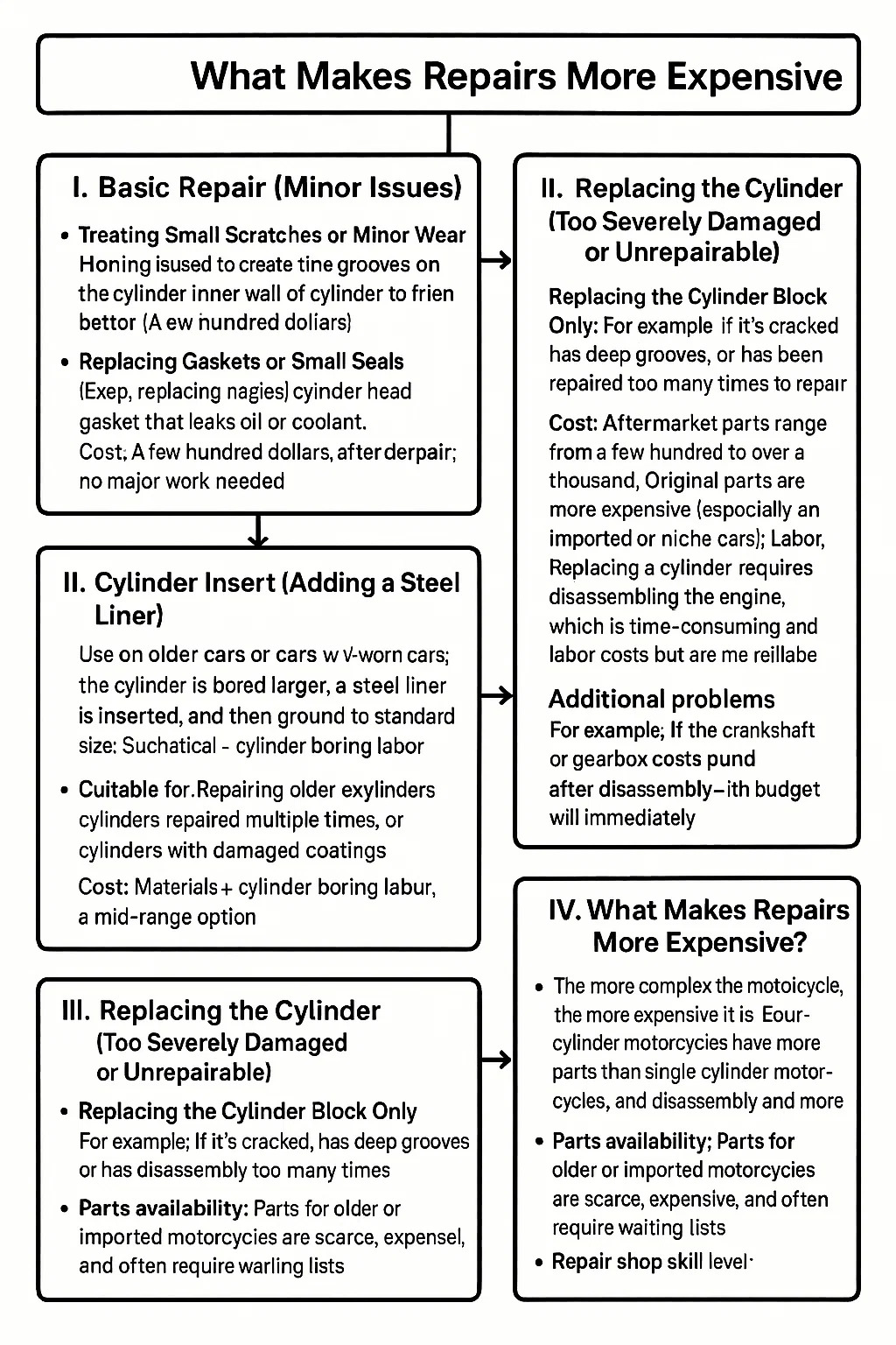 التكاليف: تكلفة قطع الغيار بالإضافة إلى العمالة تزيد من السعر الإجمالي. على سبيل المثال، قد تكلف دراجة نارية ذات اسطوانة واحدة ألف أو ألفي يوان، في حين أن دراجة نارية ذات أربع أسطوانات يمكن أن تكلف الضعف بسهولة.