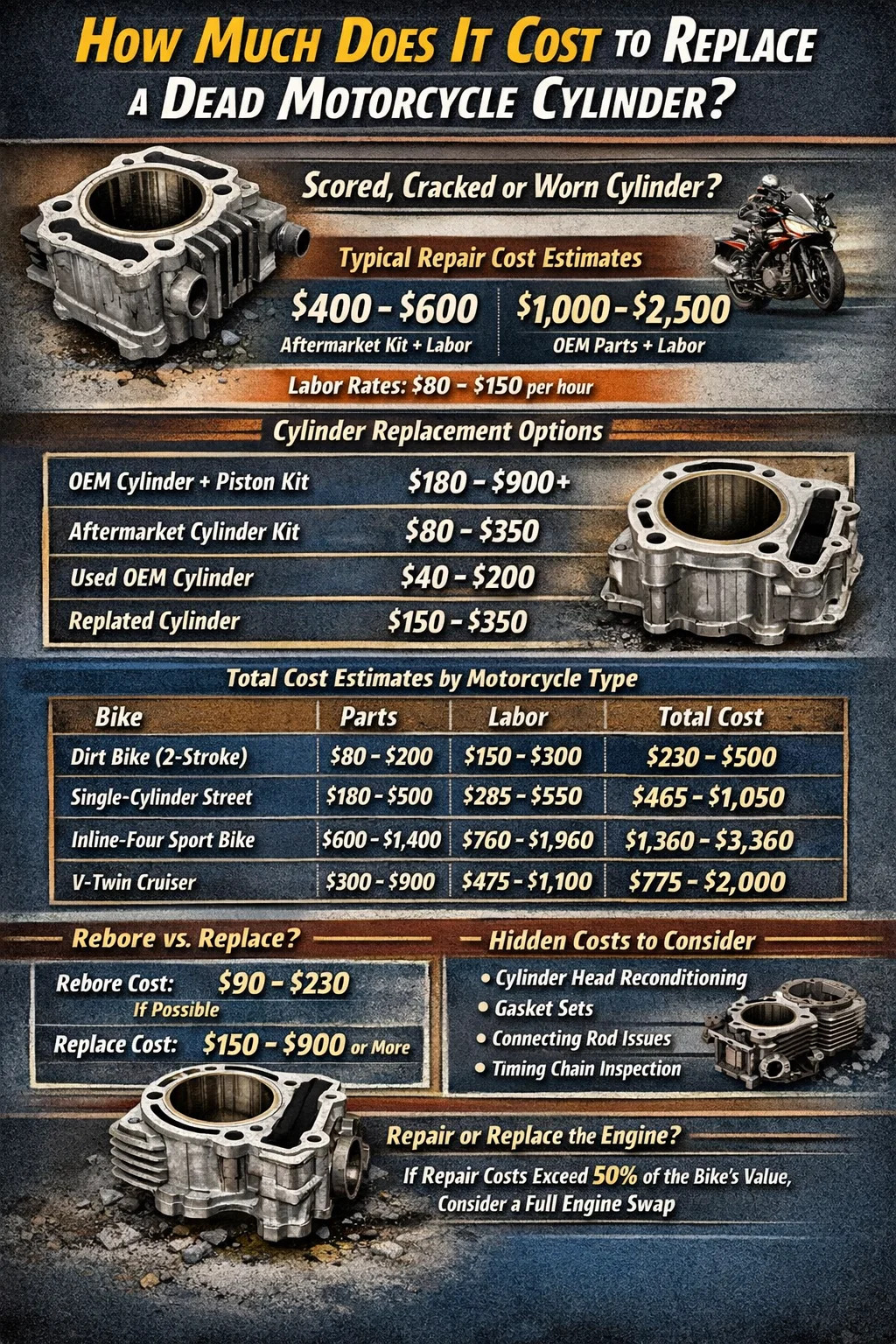 إذا تم ضبط أسطوانة دراجتك النارية أو تشققها أو اهترائها بشكل يتجاوز المواصفات، فأنت تنظر إلى فاتورة الإصلاح التي تتراوح عادةً من 300 دولار إلى 1500 دولار أو أكثر ، اعتمادًا على نوع المحرك، وتكلفة الأسطوانة البديلة أو مجموعة الأسطوانات، ومعدل العمالة في متجرك. على دراجة ركاب صغيرة ذات أسطوانة واحدة، يمكن أن تكلف مجموعة أسطوانات ما بعد البيع الصديقة للميزانية ما يتراوح بين 80 إلى 150 دولارًا للأجزاء وحدها. على دراجة رياضية مزدوجة أو رباعية الأسطوانات عالية الإزاحة، يمكن لمكونات أسطوانة OEM أن تتجاوز 600 دولار إلى 900 دولار قبل أن يلتقط الميكانيكي مفتاح الربط. أضف العمالة - التي تتراوح عادةً ما بين 80 إلى 150 دولارًا في الساعة - والوظيفة التي تستغرق من أربع إلى ثماني ساعات، وسيرتفع إجمالي التكاليف بسرعة.