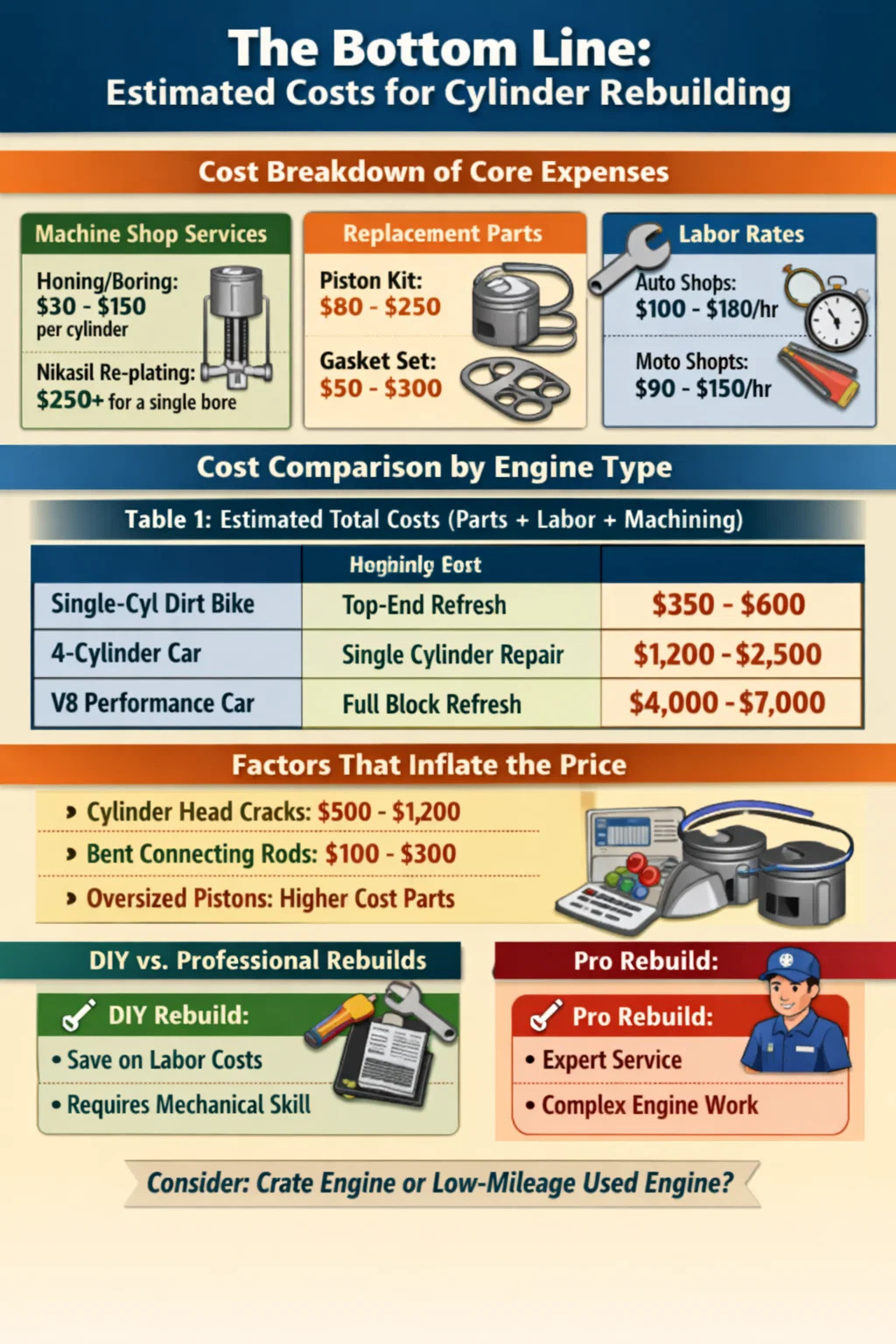 تتراوح تكلفة إعادة بناء الأسطوانة بشكل عام من من 500 إلى 1500 دولار لكل أسطوانة لمحركات السيارات، بينما واحدة اسطوانة دراجة نارية يمكن في كثير من الأحيان أن يتم تحديثها بين 300 دولار و 800 دولار . تختلف هذه الأرقام بشكل كبير بناءً على ما إذا كنت تقوم بعملية تحديث "أعلى مستوى" (الحلقات والحشيات) أو عملية ترميم ميكانيكية كاملة تتضمن مكابس مملة وشحذية وكبيرة الحجم. إذا قمت بإجراء عملية التفكيك بنفسك، فيمكنك توفير الكثير من العمالة، وهو ما يمثل عادةً 60% إلى 70% من إجمالي الفاتورة.