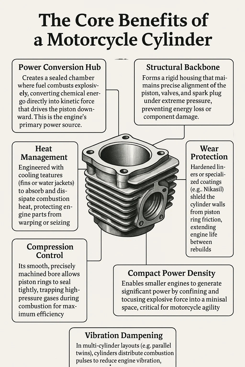 تبديد الحرارة | الزعانف (المبردة بالهواء) أو ممرات سائل التبريد (المبرد بالسائل) تسحب الحرارة بسرعة بعيدا عن الاحتراق. | يحمي المحرك من ارتفاع درجة الحرارة ، حتى أثناء الركوب الصعب. |