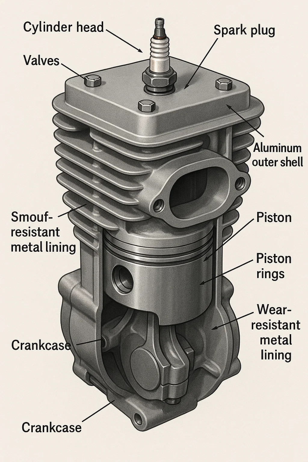 عادة ما يكون له غلاف خارجي من الألومنيوم (تبديد سريع للحرارة وخفيف الوزن)، مع بطانة معدنية مقاومة للتآكل من الداخل (مثل طلاء النيكل والسيليكون أو بطانة الحديد) لمنع التآكل من المكبس.